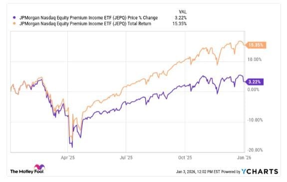 Y esa rentabilidad es muy rentable. El ETF JEPQ ha subido solo un 3.2% en el último año. Pero al sumar la rentabilidad total, se obtiene un aumento del 15.3%.