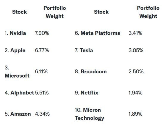 Esta es la parte que me encanta. Porque ahora nos adentramos en algunas de las mejores acciones del mercado. El Nasdaq-100 comprende 100 de las mayores empresas no financieras que cotizan en la bolsa Nasdaq, y está dominado por acciones tecnológicas. Las 10 principales participaciones representan el 43% del fondo e incluyen a las principales acciones tecnológicas del mundo.