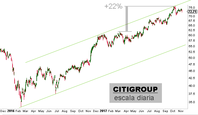 Si bien es cierto que la mayor parte de bancos americanos se encuentran en los niveles clave antes indicados, hay excepciones, como es el caso de CITIGROUP, que se encuentra a más de un 20% por encima de los máximos de marzo de este año: