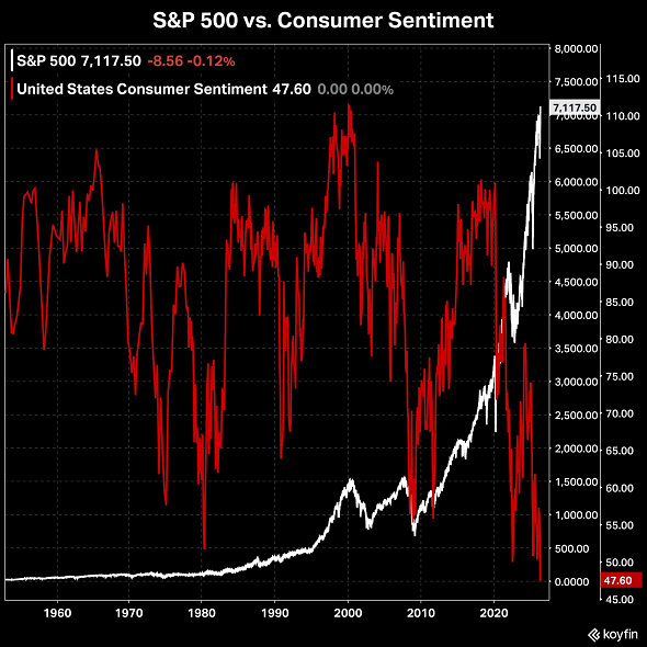 Eso sí, la guerra pasa factura. El mercado y la confianza de los consumidores nunca habían estado tan desconectados. El índice de confianza del consumidor de la Universidad de Míchigan se encuentra en su nivel más bajo de la historia, mientras que el S&P 500 está cerca de su máximo histórico.