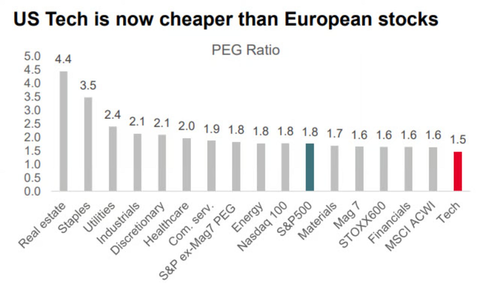 Lo que está claro es que si la bolsa quiere abonarse a las alzas, necesitará a la tecnología. En comparación con las previsiones de crecimiento de los beneficios, el sector tecnológico cotiza con un fuerte descuento, según Société Générale.