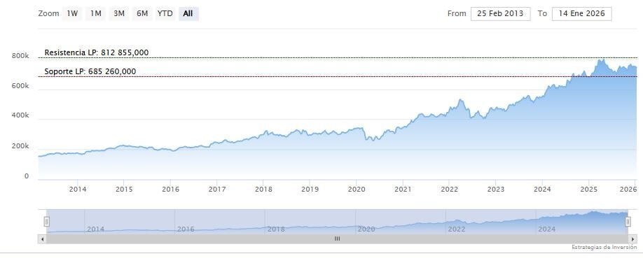 Berkshire Hathaway cerraba la sesión del miércoles al alza en los 743.437,69 dólares. Las medias móviles de 70 y 200 periodos se encuentran encima de las dos últimas velas, RSI al alza en los 44 puntos y las líneas del MACD apenas debajo del nivel de cero.