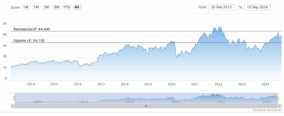 En Bank of America media móvil de 70 periodos encima de las últimas cuatro velas, RSI a la baja en los 40 puntos y las líneas del MACD cruzan debajo del nivel de cero. El soporte a mediano plazo se encuentra en los 35.15 dólares. Mientras, los indicadores de Ei se muestran mixtos.