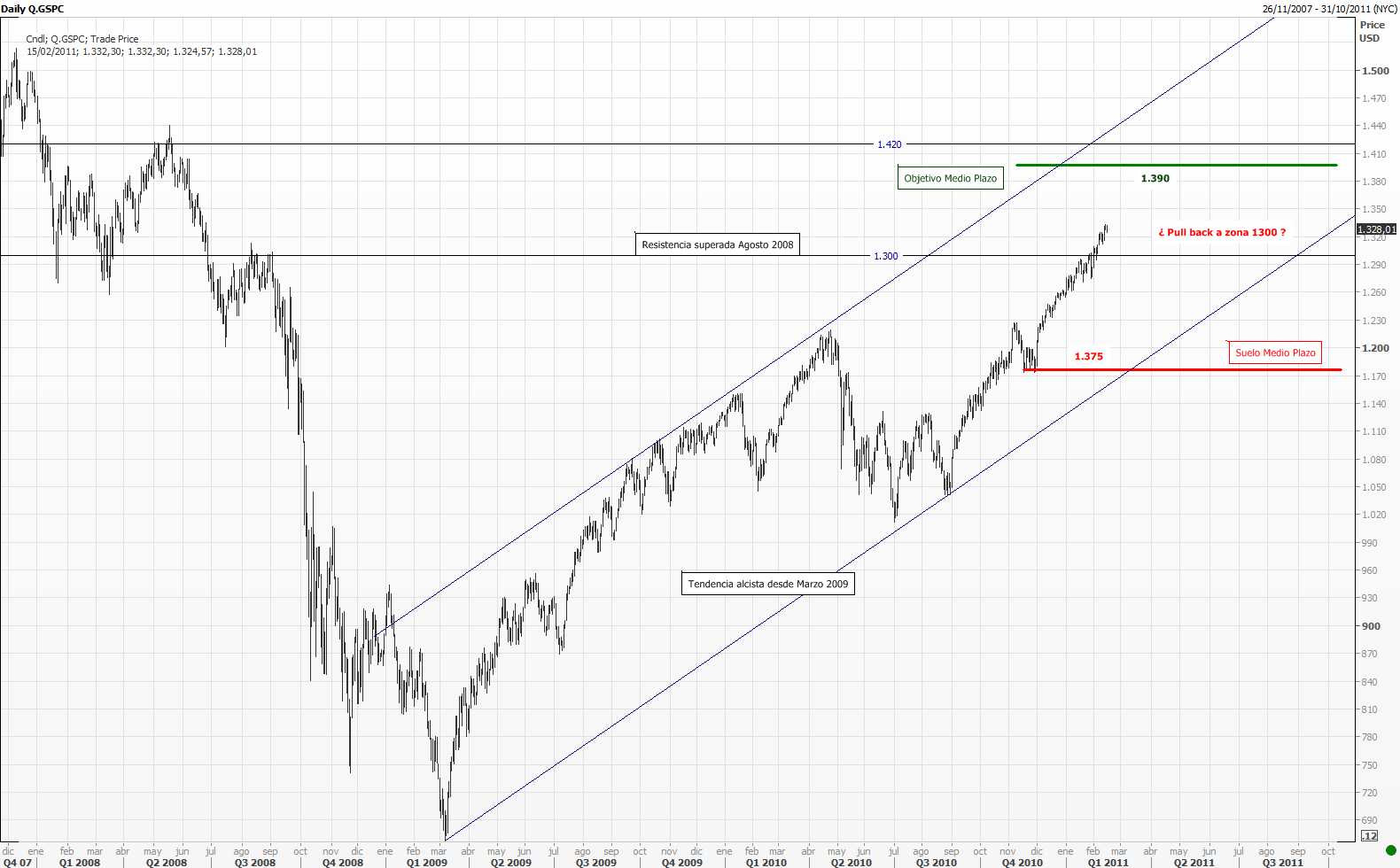 A medio plazo tanto la línea de tendencia desde Marzo de 2009 como el suelo situado en la zona de 1.375 son las referencias para el mantenimiento de la previsión de revalorización adicional del índice en un 4,5% desde los niveles actuales.