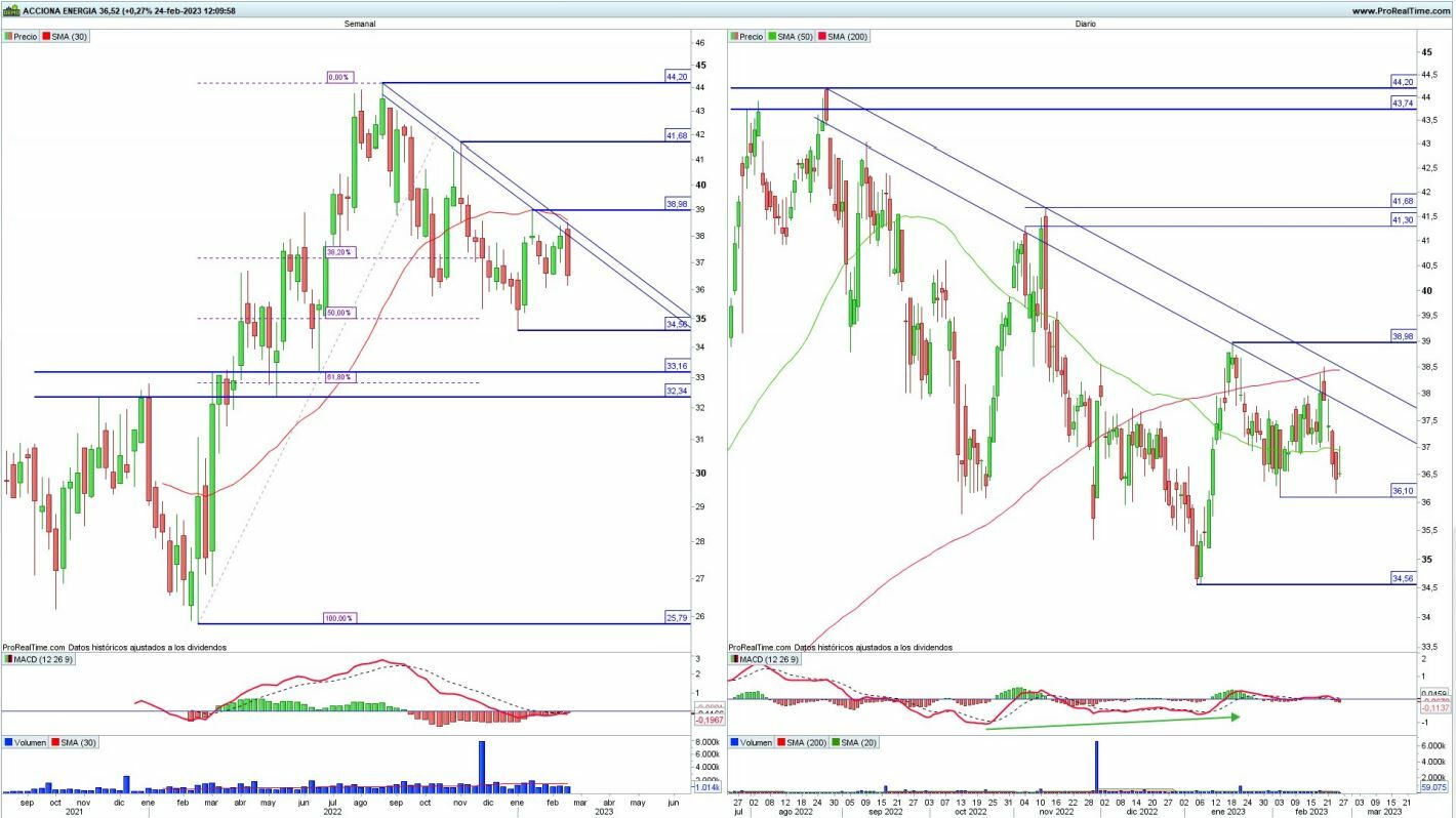 Acciona Energía en gráfico semanal (Izq.) y diario (Dcha.) con Rango de amplitud medio en porcentaje, oscilador MACD y volumen de contratación