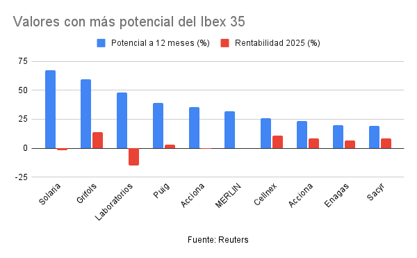 En el lado opuesto, hasta siete valores del IBEX 35 presentan un potencial negativo a 12 meses vista, de acuerdo con los analistas recopilados por Reuters: son ACS, Banco Sabadell, Unicaja, Caixabank, Telefónica, BBVA y Bankinter.
