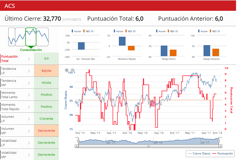 Desde enero, la compañía que dirige Florentino Pérez sube un 8,79%. Los indicadores de la zona premium de EI dan a ACS una puntuación de 6 sobre 10, al encontrarse en fase de consolidación, con tendencia alcista en el medio plazo pero bajista en el largo, con una volatilidad decreciente en ambos periodos.