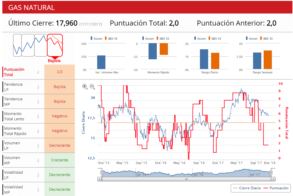 Hoy Gas Natural logra alcanzar los 18 euros por acción, al subir un 0,22%. Los indicadores de Estrategias de Inversión dan a la compañía una puntuación de 2 sobre10. Se encuentra en fase bajista, con dicha tendencia tanto a medio como a largo plazo y una volatilidad decreciente en ambos peridos.