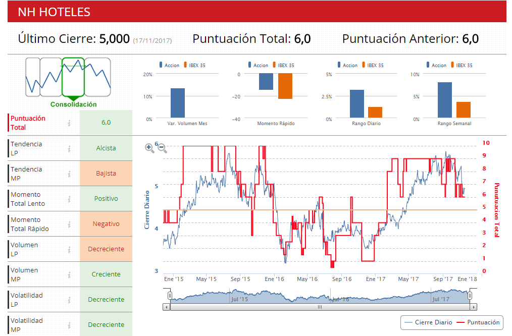 En el acumulado anual, las acciones del grupo hotelero suben un 30%. Los indicadores técnicos de Estrategias de Inversión dan una puntuación a NH de 6 sobre 10, compañía que se encuentra en fase de consolidación, con una tendencia bajista en el medio plazo, pero alcista en el largo y una volatirlidad decreciente en ambos periodos.