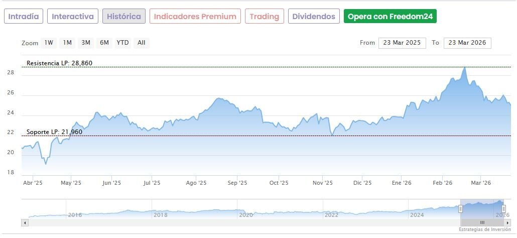 Hoy las acciones de Aena suben a media mañana un 0,88% hasta marcar 25,19 euros en el IBEX 35. Los títulos acumulan una subida de un 5,75% en lo que va de 2026 y suben un 26,58% desde sus mínimos de abril del año pasado (19,90 euros). No obstante, han corregido un 12,7% desde los máximos conquistados en febrero.