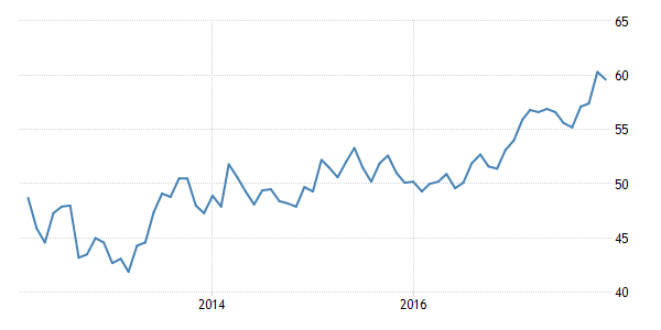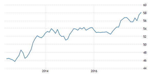 Si miramos al gráfico de compuesto, tenemos buenas noticias para la economía de la zona euro, ya que saben de la correlación entre el crecimiento y el índice de directores de compra compuesto. En este gráfico podemos observar que en 2017 ya hemos superado los máximos de 2014, por lo que vamos a la buena dirección. Evidentemente, esto es también presión para que el BCE termine con su política monetaria actual.