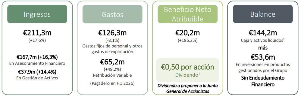 Los ingresos totales de Alantra en el conjunto del año fueron de 211,3 millones de euros, un 17,6% más. De esa cifra, los ingresos de asesoramiento financiero crecieron un 16,3%, hasta 167,7 millones, impulsados por un mayor foco estratégico en operaciones de mayor calidad y una mayor colaboración entre oficinas.