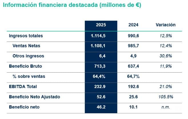 El EBITDA ha alcanzado los 232,9 millones de euros, un aumento del 20,9% frente a los 192,2 millones de 2024, en línea con las previsiones y con la senda de crecimiento a largo plazo de la compañía. El crecimiento de las ventas durante 2025 ha superado al ritmo de la inversión, especialmente en gastos de venta, generales y administrativos (SG&A).