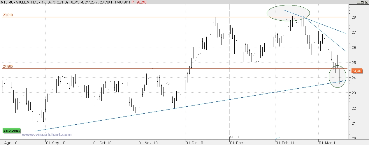 La cotización que mejor sale de este ranking de las tres peores es Amadeus IT Holding al bajar un 12,70% en lo que llevamos de año. En este tramo las acciones han llegado a un máximo de 15,70 euros y un mínimo de 13,15 euros. Los títulos del proveedor tecnológico en la industria de viajes subieron ayer un 1,90% hasta conseguir situar su cotización en 13,40 euros. Parece que el desastre nipón no ha afectado a la actividad de Amadeus en Japón. Desde la compañía se dice que “operan con normalidad” aunque aseguran que “aún es pronto para valorar el impacto del terremoto en su actividad. La cuota de mercado de la compañía en ese país alcanza el 5%.