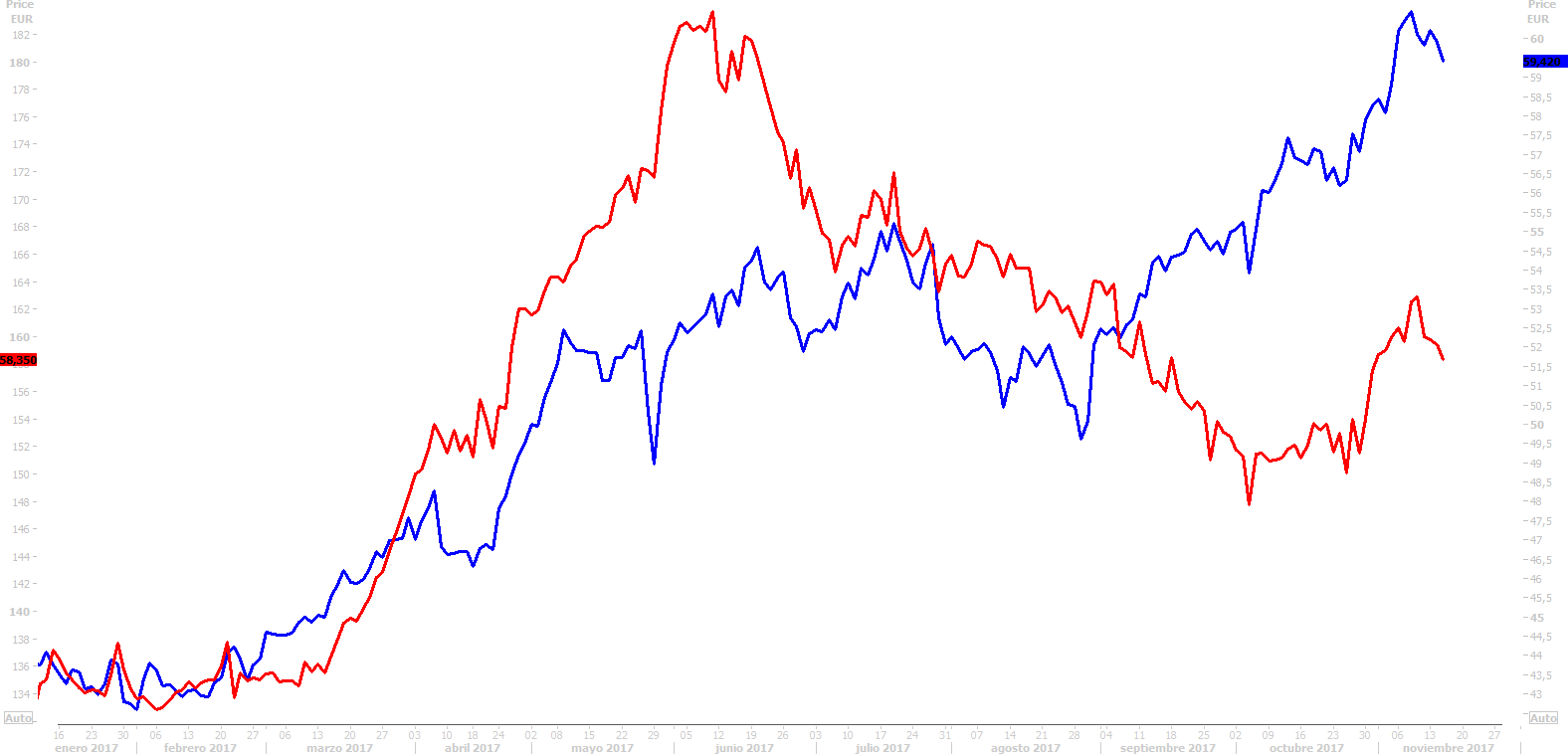 Aunque Amadeus y Aenasuben en noviembre una lo hace más que la otra. Y es que Amadeus avanza en torno a un 2,5% en el mes, mientras que Aena se revaloriza un 0,75%, lo que en ambos casos le sirven para ser las mejores compañías del Ibex 35 en el mes, al ser las únicas que registran ascensos.