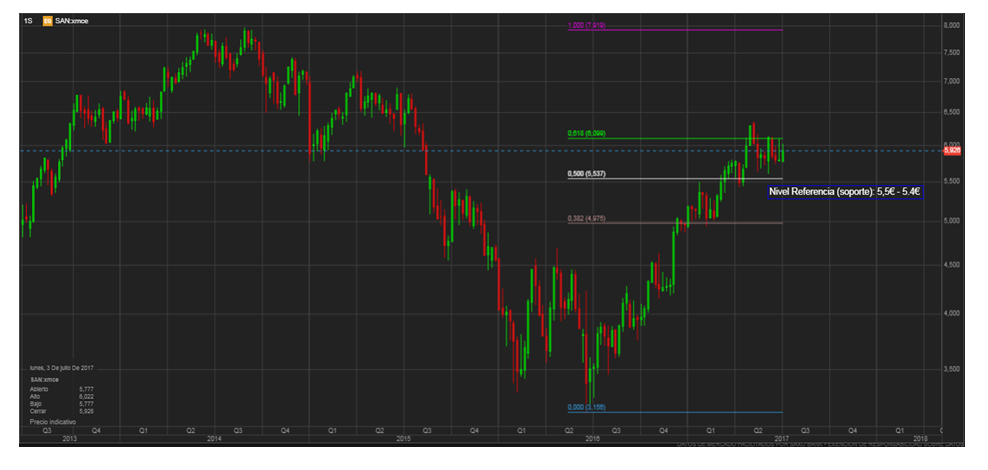 Técnicamente, Borja Rubio, head of brokerage en España de la firma, explica que Banco Santander mantiene intacta la estructura alcista desde mediados de 2016 (post-Brexit) recuperando más del 60% de caída desde los máximos de 2015 sobre los 8 euros por acción. En el último trimestre, está consolidando niveles entre los 6,3 euros y los 5,5 euros, situando como niveles clave de referencia los soportes de 5,6 euros (mínimos de junio) y los 5,4 euros (mínimo de abril)".