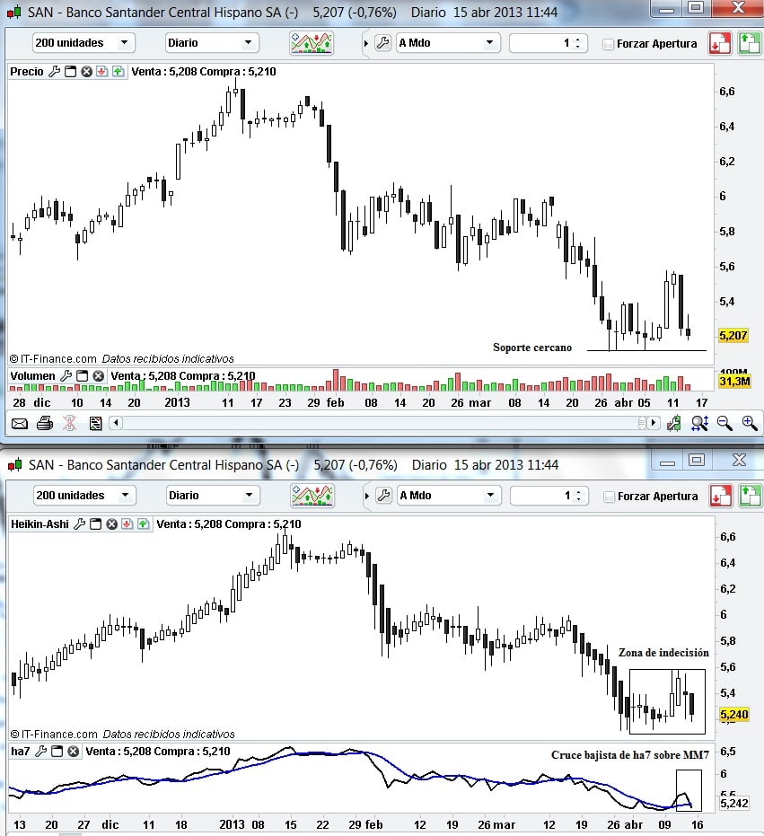 Vemos en el gráfico de Velas Japonesas un soporte cercano, y en el gráfico de Velas Heiken-Ashi una zona de indecisión con varios Doji y Doji-like que constituyen una pequeña tendencia lateral y que parece que pueda iniciarse una tendencia bajista a corto plazo.
