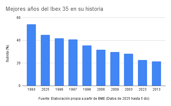 Hasta el 5 de diciembre, el IBEX 35 acumula una revalorización en 2025 de casi un 44%, ligeramente por encima de las revalorizaciones que se anotó en 1996 (41,97%) y 1997 (40,75%), que suponen hasta el momento el segundo y el tercer mejores ejercicios en sus 33 años de historia.