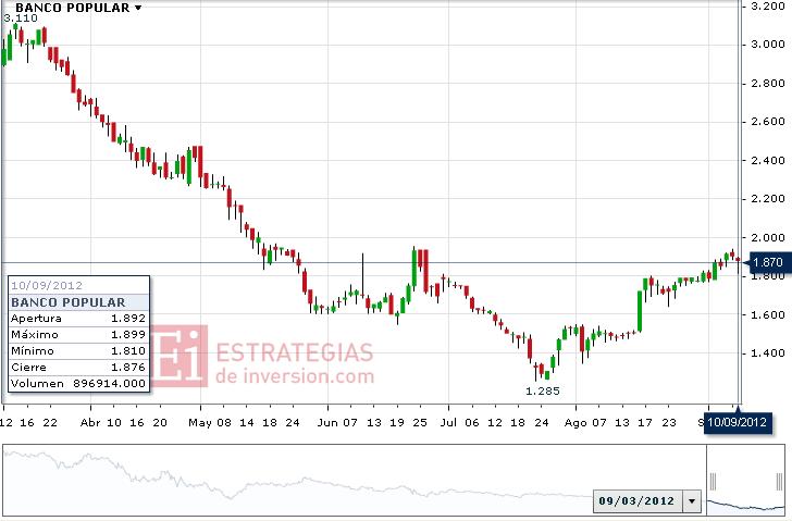 Técnicamente, Luis Francisco Ruiz, analista de Estrategiasdeinversion.com, comenta fija las resistencias de Popular en 1,95 y 2,20 euros, mientras que encontraría soporte en 1.64 y, posteriormente, en 1.55”.
