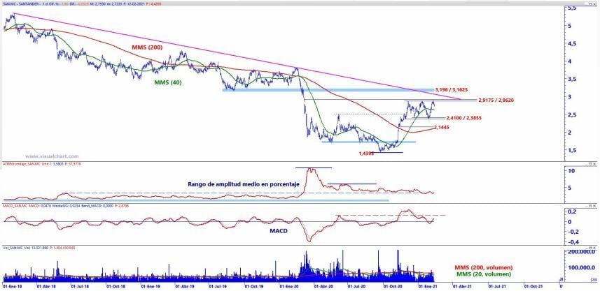 Santander en gráfico diario con Rango de amplitud medio en porcentaje, oscilador MACD y volumen de contratación