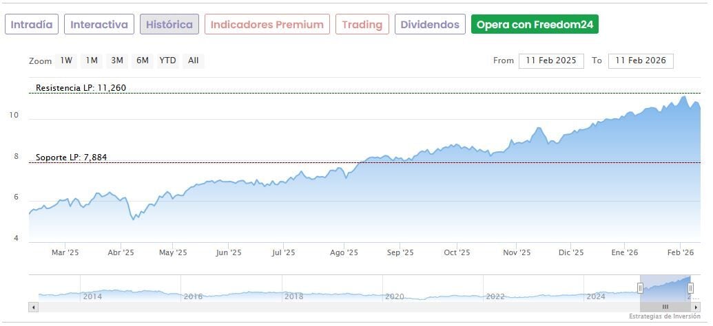 La nueva valoración supone un potencial alcista de un 16,8% para unas acciones que han subido un 127,5% desde sus mínimos de las últimas 52 semanas, fijados en 4,645 euros desde abril del año pasado. Los títulos tocaron unos máximos históricos en los 11,26 euros el pasado 3 de febrero, justo antes de los resultados, pero desde entonces han corregido más de un 6%.