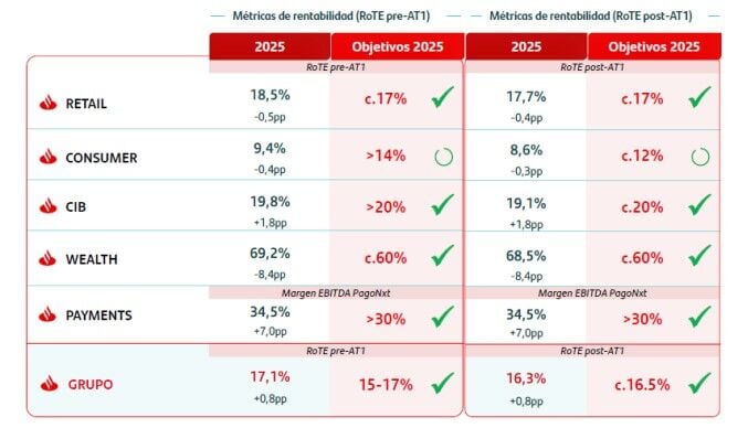 La experta de Renta 4 espera que el Santander ponga sobre la mesa un objetivo de RoTE post-AT1 por encima del 20% para 2028 (vs 17,1% pre-AT1 y 16,3% post – AT1 en 2025). Asimismo, el nuevo plan estratégico podría tener “un enfoque claro en demostrar cómo su transformación se traducirá en un crecimiento rentable y sostenible, apoyado nuevamente en la implementación de su estrategia ‘One Transformation’ e impulsar su plataforma ‘Gravity’, dos elementos clave que deberían traducirse en una optimización de costes.