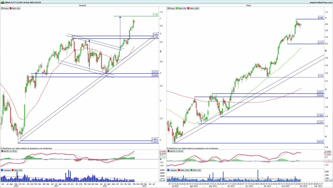 BBVA en gráfico semanal (Izq.) y diario (Dcha.) con Rango de amplitud medio en porcentaje, oscilador MACD y volumen de contratación