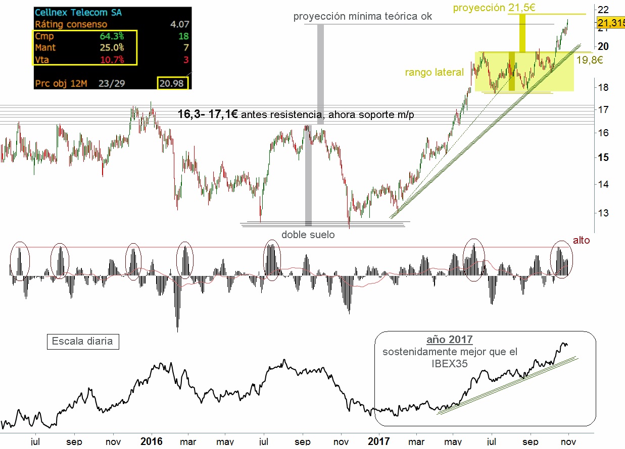 El mejor comportamiento respecto al IBEX35 logra un nuevo máximo histórico. Pese a que dos proyecciones alcistas teóricas se han visto cumplidas, todo precio por encima de 19,8 euros obliga a mantener.