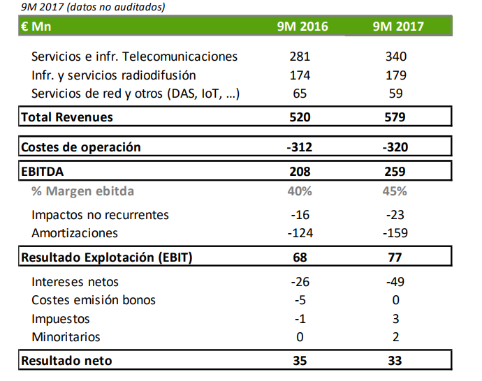 La compañía también ha destacado Por líneas de negocio, los servicios e infraestructuras para telecomunicaciones aportaron a los ingresos totales el 59%, con 340 millones de euros, un crecimiento del 21% respecto a septiembre de 2016. La actividad de infraestructuras de difusión aportó un 31% de los ingresos con 179 millones de euros.