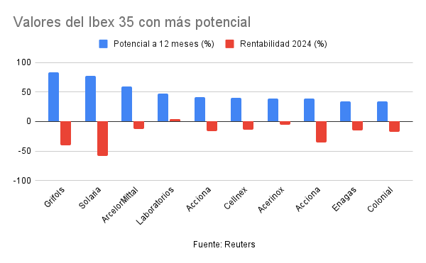 Con potenciales también muy elevados se encuentran ArcelorMittal, Laboratorios Rovi y Acciona. En el caso del gigante del acero, no tuvo un buen 2024, con una caída de más de un 12%, pero los analistas fijan su precio objetivo en 35,43 euros, casi un 60% por encima de los niveles actuales. Un factor que parece avalar esta tendencia ascendente es el rebote de más del 15% que el valor ha tenido desde sus mínimos de agosto.