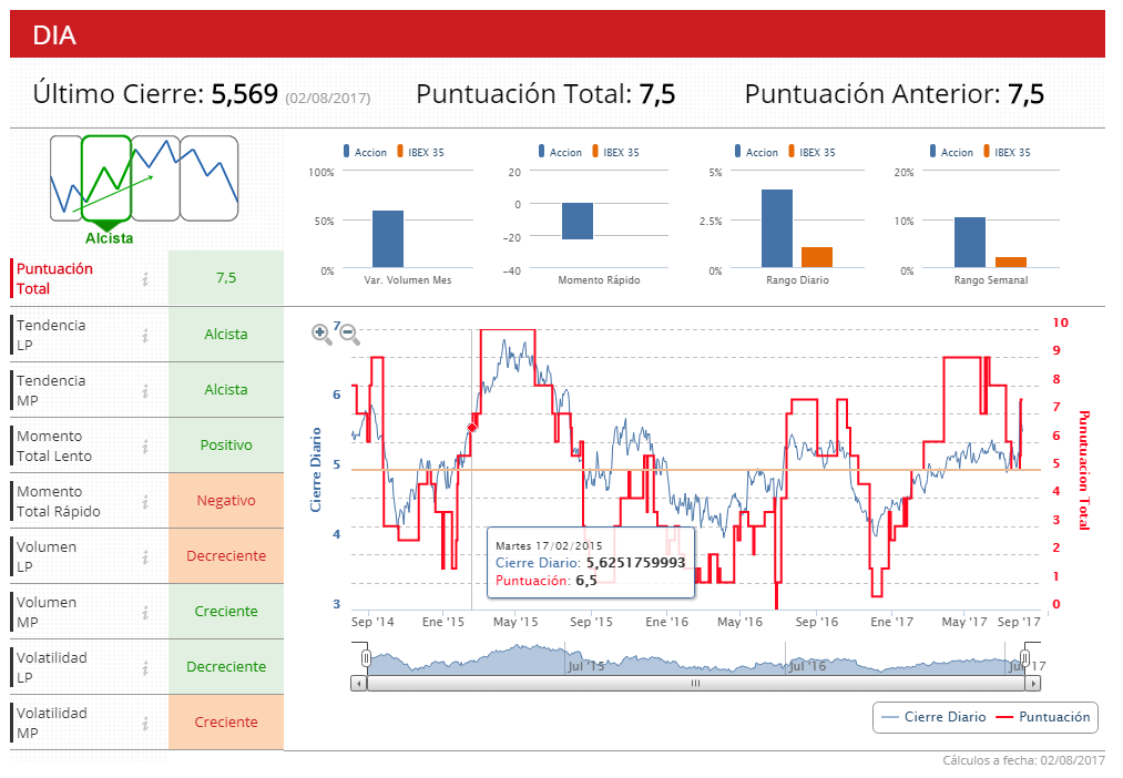 Mientras tanto, Indicadores premium de Estrategias de inversión sitúan a Dia también en fase alcista, pero su nota es de 7,5 sobre 10.