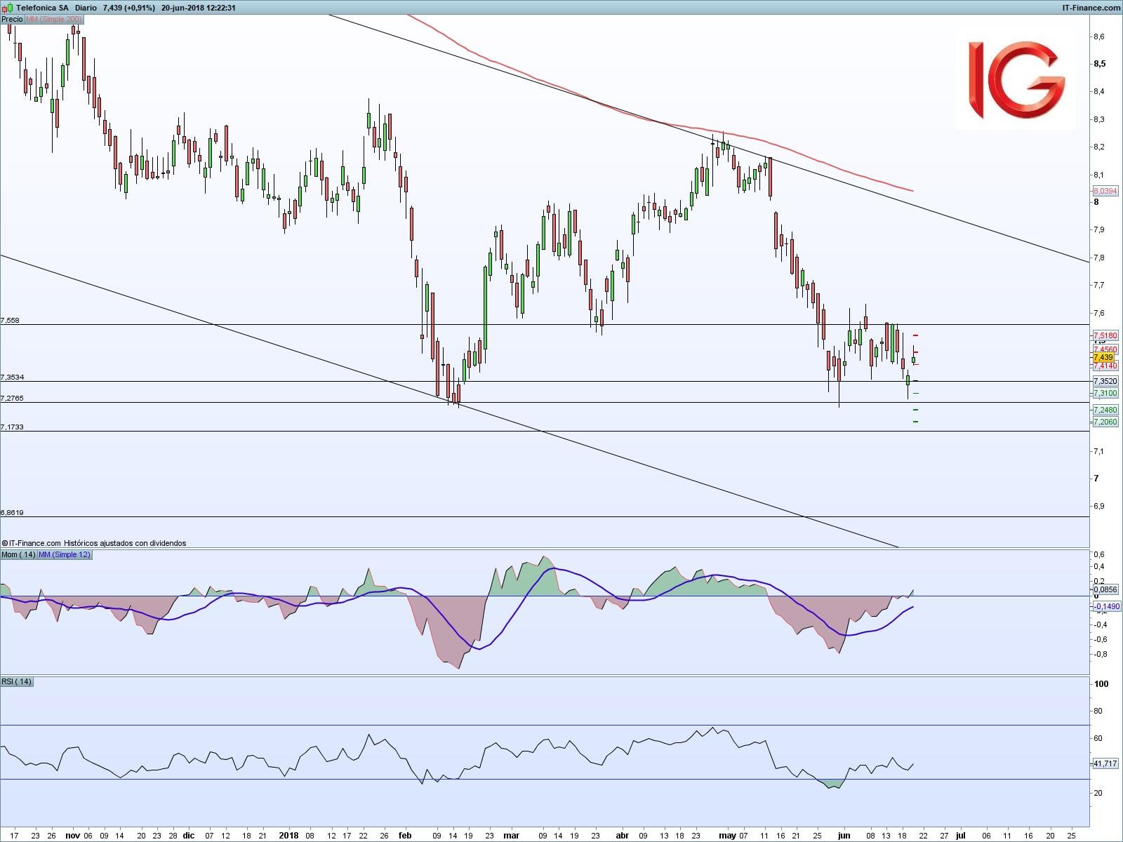 A día de hoy, la cotización se encuentra muy cerca de niveles de soporte importantes. Cotiza en 7,442 euros en un rango lateral entre 7,3534 y 7,558 euros; el primer soporte lo encontramos en el mínimo del rango. Un cierre diario por debajo de dicho nivel ampliaría las probabilidades de mayores caídas con objetivo 7,2765 euros. Y aquí tenemos otro nivel de soporte, en este caso más importante, ya que una pérdida del mismo podría llevar al precio hasta niveles de 7,14 y 6,90 en extensión.