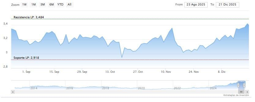Sabadell recibe buenas recomendaciones por parte de los analistas. El italiano Intesa le da un precio objetivo de 3,90 euros; JB Capital eleva su apuesta por el valor hasta los 4,50 euros por acción y esta firma argumenta que “Sabadell sigue siendo el banco más barato de Iberia, cotizando a solo 8,7 veces el PER estimado para 2027 excluyendo TSB (frente a 9,9x veces de media) y ofreciendo una rentabilidad total del 22% en 2026”. Alantra y el suizo UBS apuntan a un precio objetivo de 4 y 3,85 euros, respectivamente.