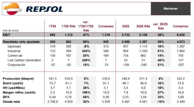 Fernández de Mosteyrín cree que “la atención se centrará en la posible revisión al alza en la guía para un 2026 dado el impacto del conflicto en Oriente Medio sobre los precios del crudo”. “Sin duda, la generación de caja se verá apoyada por unos precios que con toda probabilidad estarán por encima del escenario base planteado por Repsol en su CMD del pasado 10 de marzo (65 usd/b en brent)”.