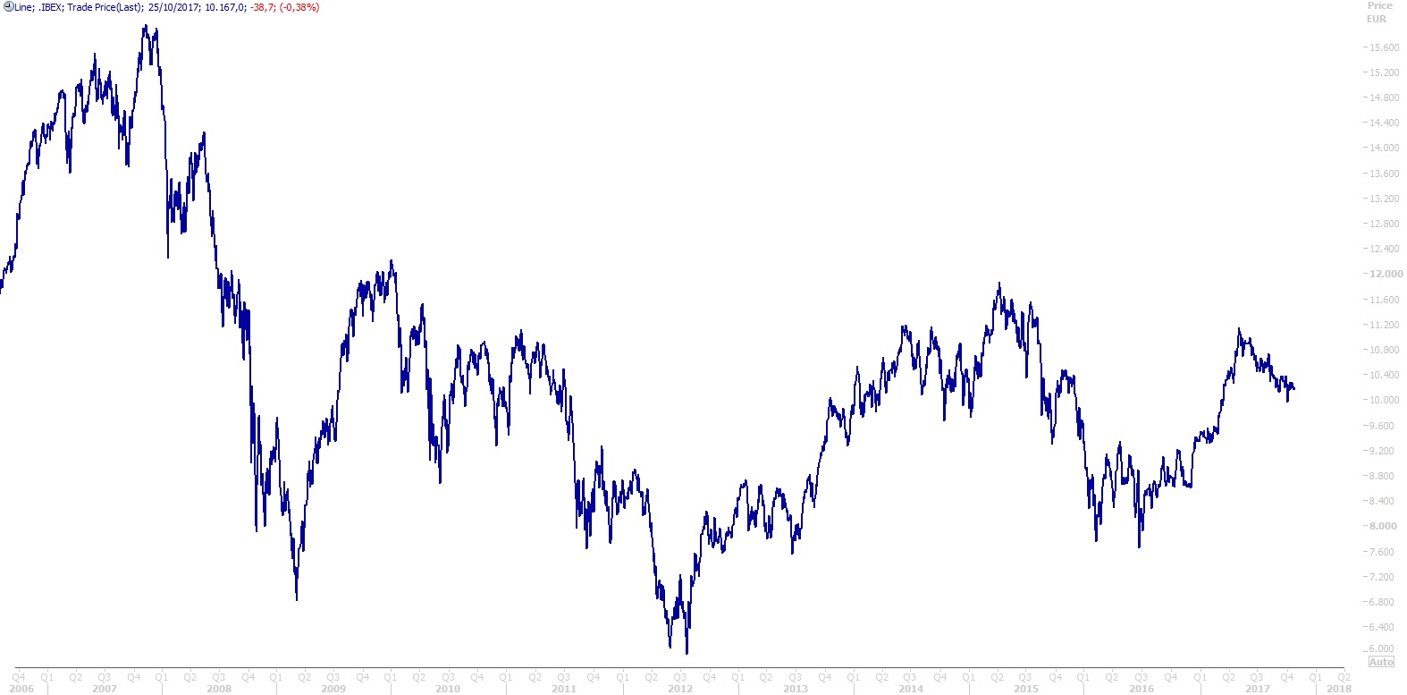 El 8 de noviembre de 2007 el Ibex 35 alcanzó los 15.945 puntos, o lo que es lo mismo, sus máximos históricos. Desde entonces, ha perdido un 36%. Si quisiera recuperar esos niveles, el principal indicador de la bolsa española debería subir un 56%. Entre esa fecha y hoy, España ha sufrido la crisis inmobiliaria y de deuda soberana de 2012, la reestructuración financiera y el referéndum de Reino Unido para salir de la UE, así como episodios de inestabilidad política.