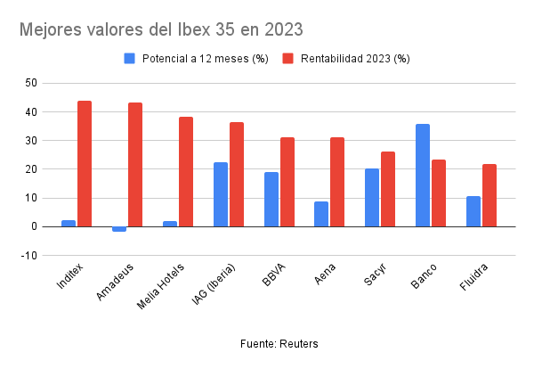 Si se pone el foco en los mejores valores del IBEX 35 en estos cuatro primeros meses de 2023, el gran protagonista ha sido Inditex. El gigante textil ha reforzado su puesto como compañía más valiosa del selectivo, con una capitalización bursátil que supera ya holgadamente los 100.000 millones de euros, tras una espectacular subida de casi un 44% en lo que va de 2023.