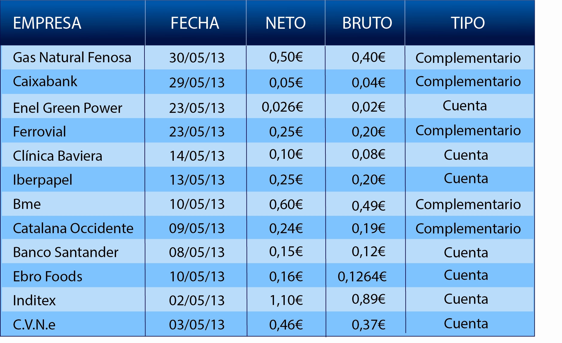 En este mes de mayo asistiremos a una lluvia de dividendos de las empresas del mercado español. Entre estas retribuciones destacan las retribuciones de blue chips, como Banco Santander e Inditex.
