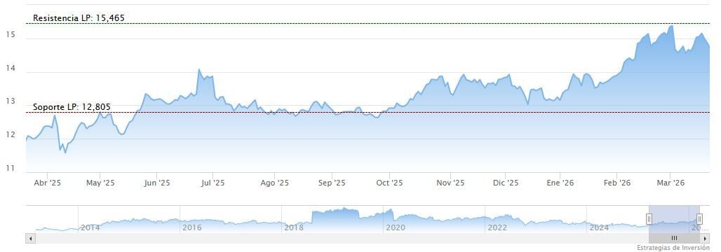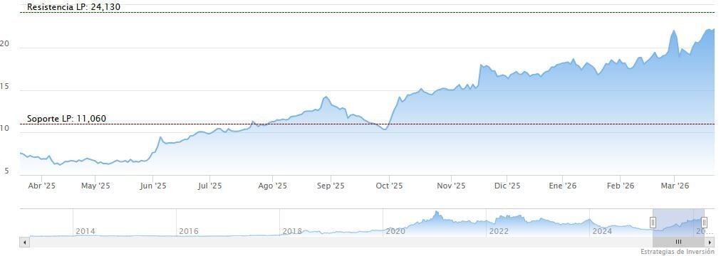 Solaria se encuentra ‘muy fuerte’ desde octubre del año pasado, cuando dio el salto desde ‘fuerte’, de acuerdo con los indicadores de fuerza. No es de extrañar, teniendo en cuenta que acumula una espectacular revalorización del 268% desde sus mínimos de abril del año pasado (6,088 euros). La acción tocó un máximo el pasado 27 de febrero en 24,18 euros, aunque desde entonces ha corregido un 7,2%. En lo que va de 2026, la subida acumulada es de un 23,5%.