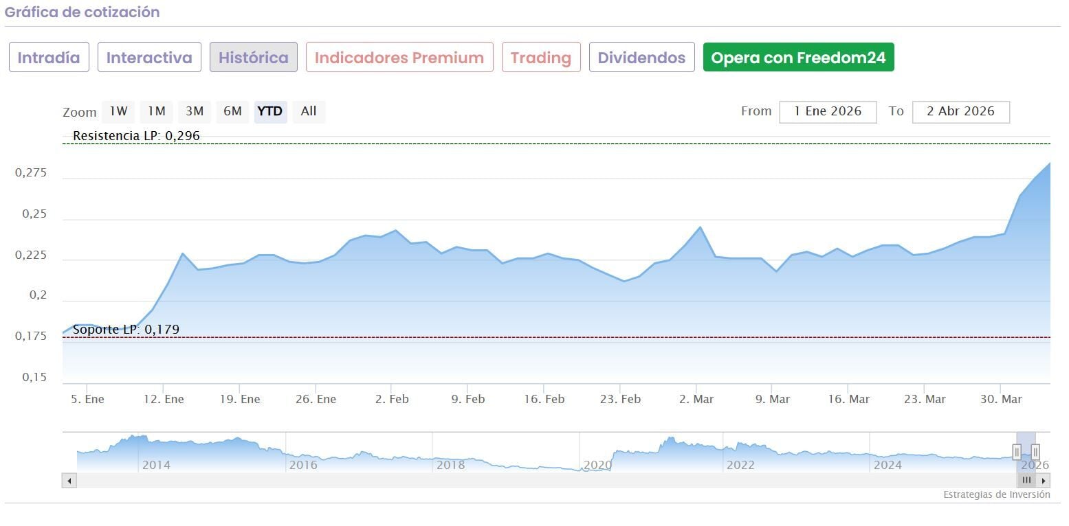 Pero lo cierto es que, durante estas semanas de guerra, incluso ha marcado sus máximos interanuales: crecimiento del 18,83% en la última semana y del 16% en el último mes, hasta marcar récord del último año el pasado día 2 en los 0,68 euros por acción.