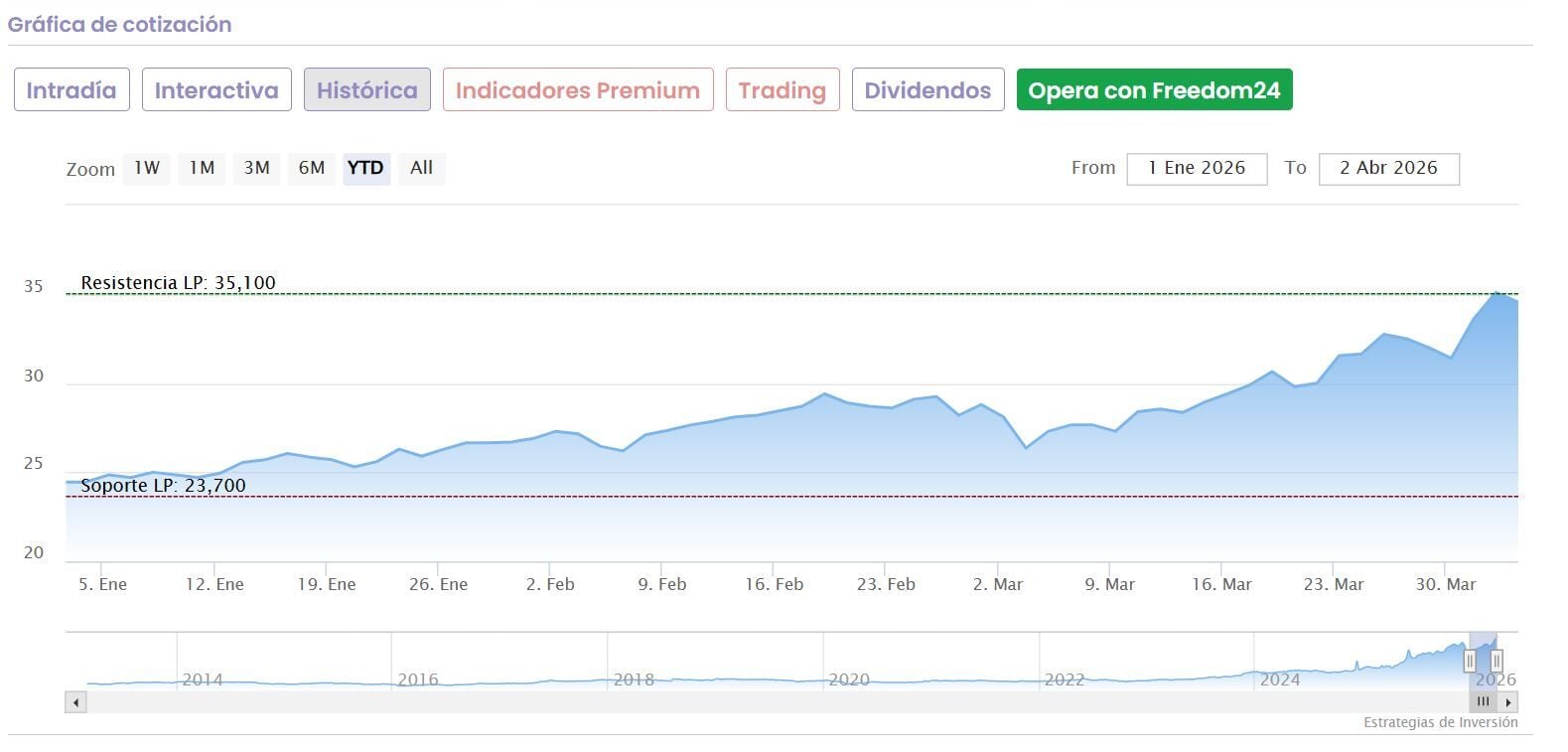 Una secuencia que le ha llevado a marcar, el pasado 1 de abril máximos en los 35,10 euros por acción, frente a sus peores niveles marcados hace un año.