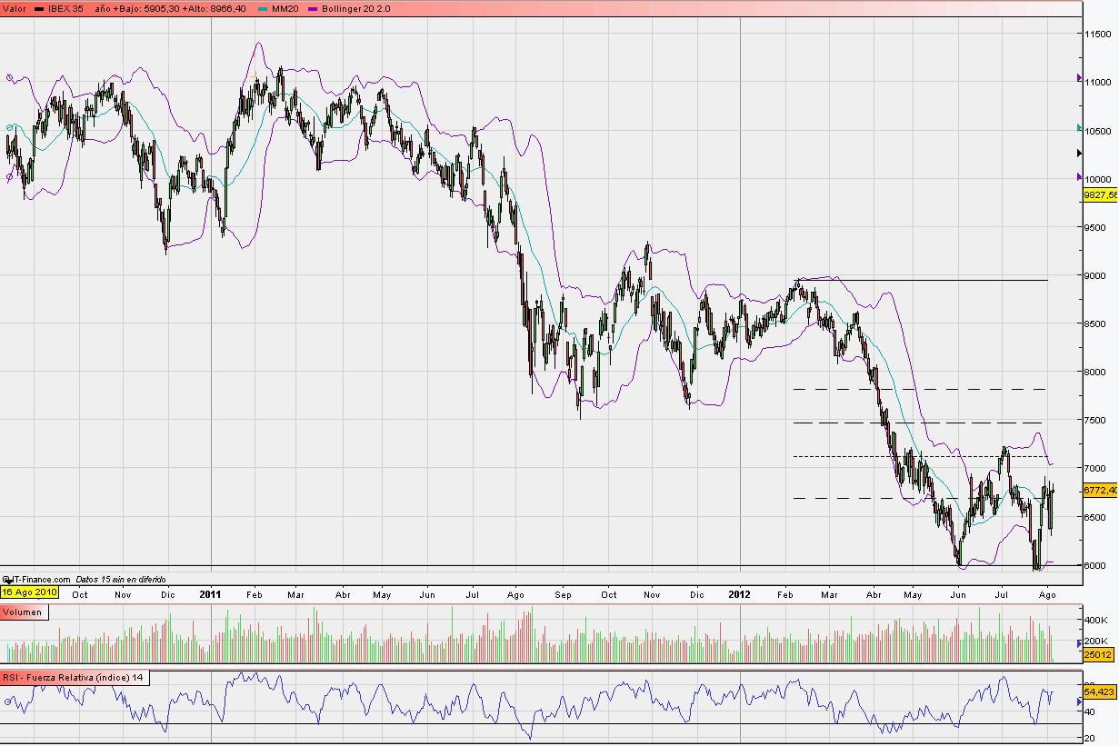 Tras las declaraciones de Draghi y la posterior reacción del mercado, que insiste en un rescate a España, el IBEX recuperó el nivel perdido descontando una decisión en forma de rescate para España. El volumen que acompañó a las dos últimas sesiones fue importante, siendo mayor en el rebote, el RSI, se encuentra en la parte media, algo sobrecomprado en torno al 54, sin señales de cambios de tendencia en lo respectivo a divergencias ni en sobrecompra.