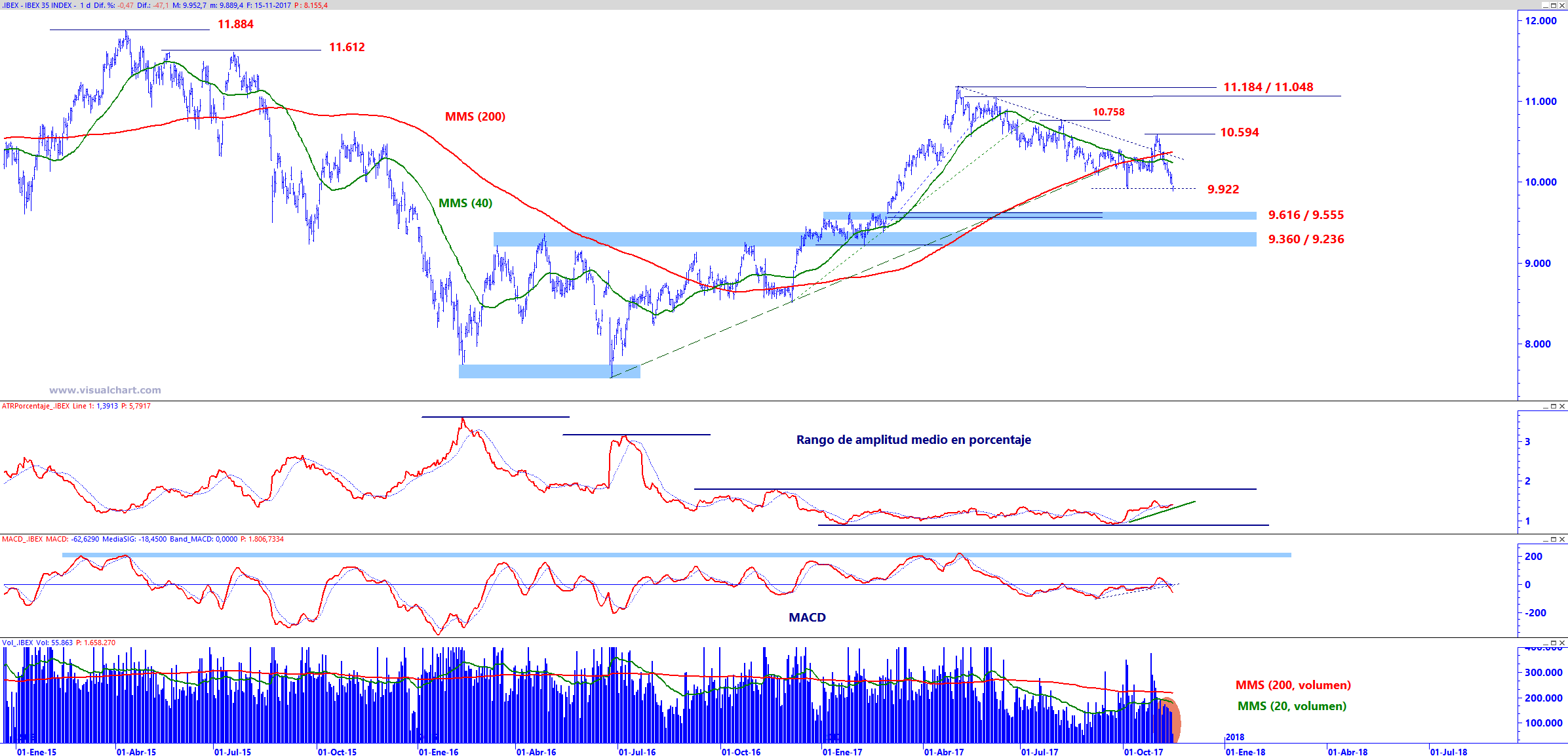 José Antonio González, analista de Estrategia de Inversión, considera que "el contundente giro a la baja registrado desde los 10.594 puntos vuelve a activar señales de venta en el oscilador MACD, en un entorno de lógico repunte en volatilidad que, pese a ello, sigue en niveles no preocupantes y que, sin embargo, no viene respaldado por aumentos en el niveles de contratación. Todo esta argumentación nos permite concluir que la situación técnica, si bien pierde momento positivo en el corto plazo al amenazar la viabilidad de los mínimos del pasado mes de OCT17 situados en los 9.922 puntos, no supone una alteración grave por el momento desde una perspectiva de vigencia de su estructura creciente primaria".