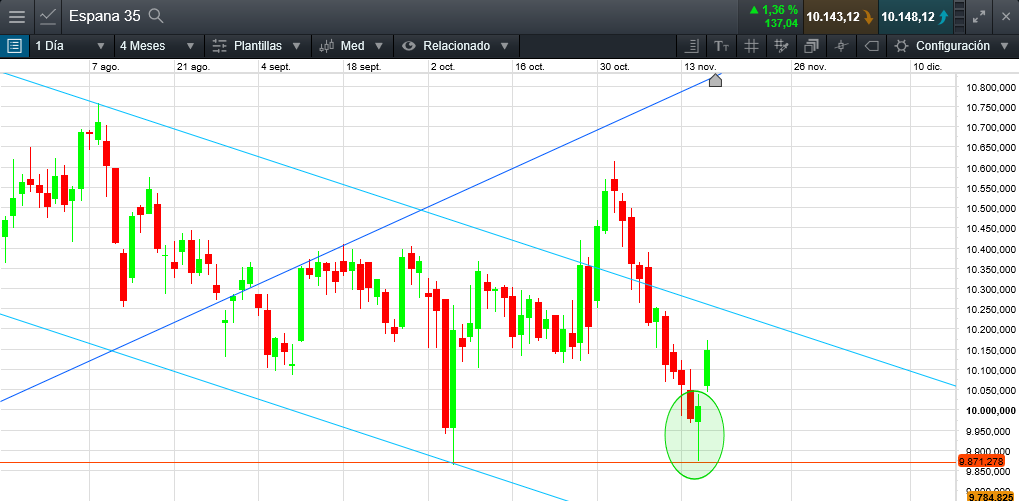 El analista de CMC Markets, José Luis Herrera, señala que "para pensar en la continuación de las subidas, es importante respetar el nivel de soporte que por el momento está siendo válido: los mínimos de la jornada del pasado 5 de octubre que ayer fueron de nuevo testeados y respetados (en el gráfico a continuación, con el círculo verde). Tras rebotar desde dicha zona, el nivel más inmediato a batir son los 10.130-10.150 puntos, que antes fueron soporte y ahora resistencia. Si supera ese nivel, que además supondría batir la directriz bajista que venía frenando la cotización del índice desde la ruptura en falso de finales del mes pasado, habría otros niveles intermedios pero comenzaría a cambiar la estructura a nivel técnico, tornándose en alcista en el corto plazo".
