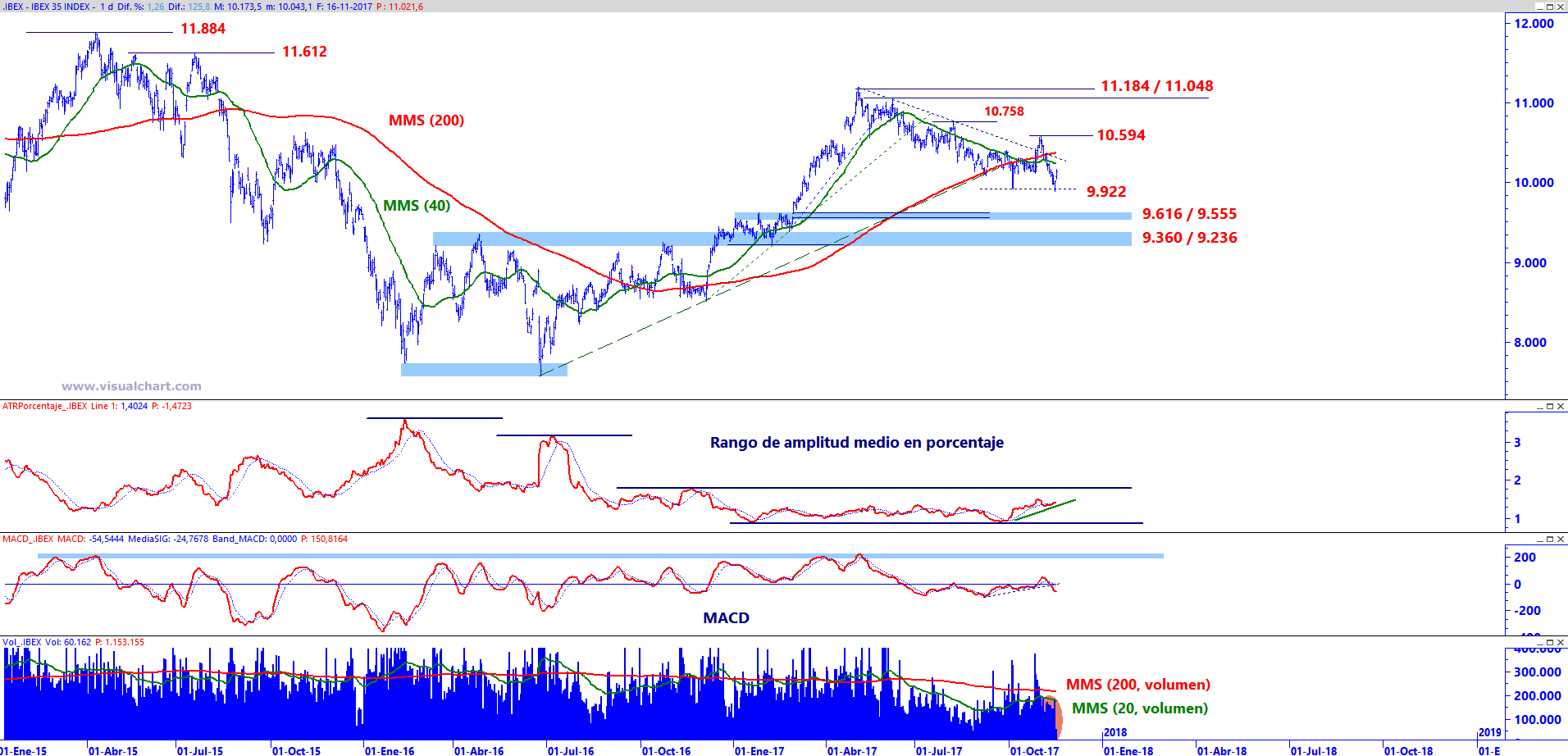 "El rebote es contundente en precio y deberá ser corroborado al cierre de mañana viernes, de trascendencia semanal, lo que permitiría a las compras ganar en confianza tras unas sesiones de continuo goteo a la baja que, sin embargo, no se ha visto respaldado por un repunte en el volumen de contratación. En este sentido, la consolidación por encima de los 9.922 puntos debería servir a las compras para buscar de nuevo los máximos de NOV17 situados en los 10.594 puntos", añade.