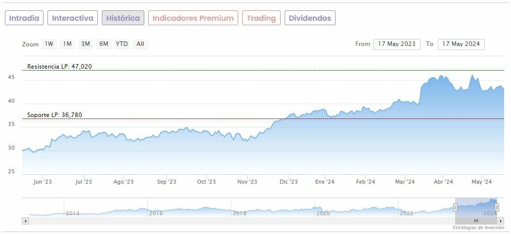 Hoy las acciones suben un 0,05% a media mañana hasta marcar 43,17 euros en el IBEX 35.