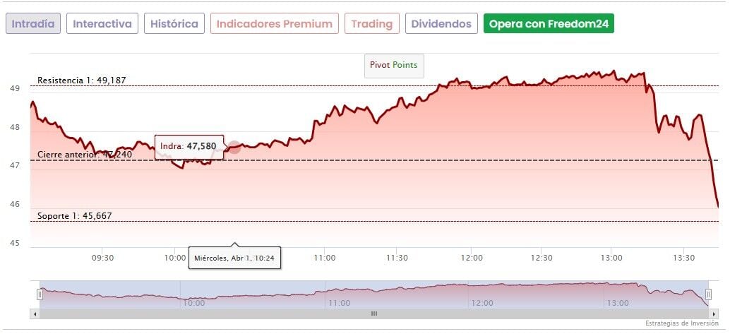 Hoy las acciones de Indra se dan la vuelta y caen un 2,12% hasta marcar 46,24 euros en el IBEX 35 poco después de conocerse la noticia, profundizando el castigo después de que en marzo fuesen las más penalizadas de todo el selectivo, con una caída acumulada en el mes de un 24,7%.