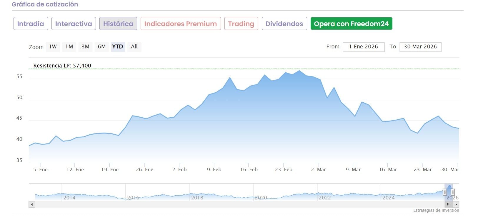 De hecho, todavía permanece en positivo con ganancias del 10,44% pero tras perder más de un 22% en el último mes, también tras los recortes de algunas firmas en su potencial recorrido, caso del JPMorgan que ha rebajado hasta los 40 euros desde los 53,5, de forma que cotiza ahora sobrevalorado en más de dos euros en el mercado.
