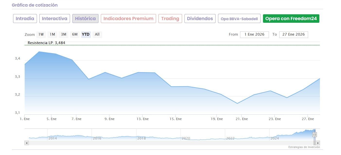 De hecho, son varias las firmas que últimamente han valorado a la entidad, y no se ponen de acuerdo sobre su potencial. Desde KutxaBank que iguala en 3,30 euros por acción el precio objetivo de UBS has el 5,37% que prolonga sus avances potenciales Bestinver, con consejo de mantener y PO de 3,48 euros por acción.