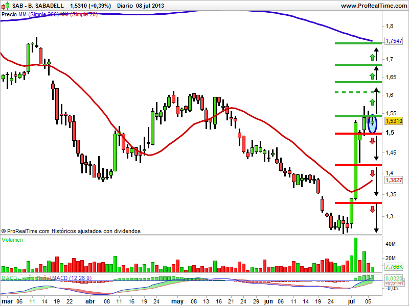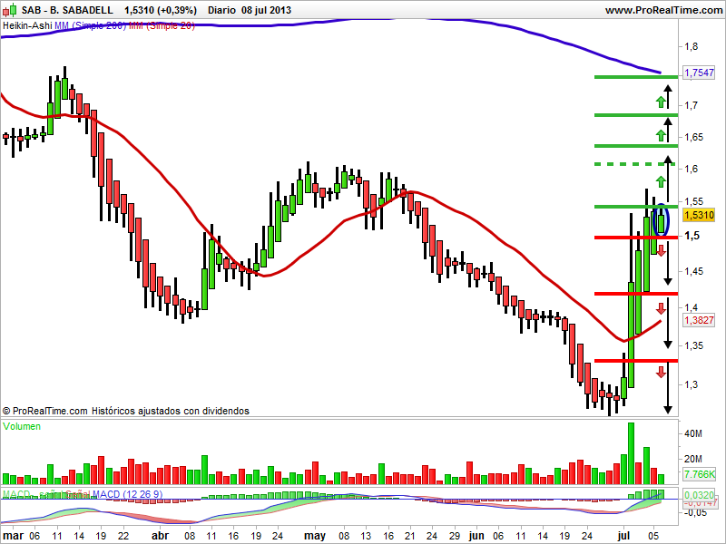 la tendencia de largo plazo es bajista. En el año 2007 durante los primeros meses formó un techo en los 6,55 euros que puso final a la tendencia alcista. A partir de aquí empezó a caer sin piedad haciendo máximos y mínimos descendentes y hasta apoyarse en los de 1,52 euros con una devaluación de un 80%. En gráfico diario la tendencia es bajista. Se apoyó en los 1,25 euros que actuaron de soporte y a partir de aquí rebotó al alza hasta encontrar una resistencia muy fuerte en los 1,54 euros donde formó un techo que ha sido una muralla para el valor. Para rebotar al alza deberá de superar la resistencia que tiene en los 1,54 euros y tendrá un buen recorrido por delante. La media móvil de 20 sesiones actúa de soporte y la media móvil de 200 sesiones actúa de resistencia. El indicador MACD está apunto de cruzar la línea cero y ser alcista. El volumen está acompañando. La vela del lunes al cierre es una peonza, la cual es una pauta que nos indica debilidad fruto del empate entre los alcistas y los bajistas.