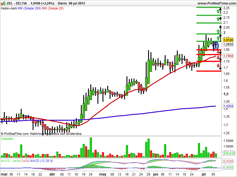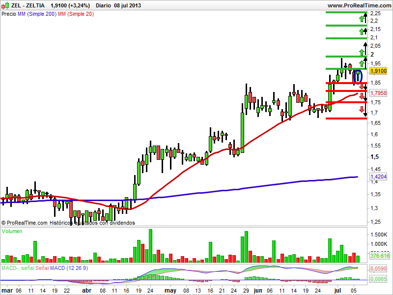 En gráfico semanal de velas japonesas la tendencia de largo plazo es bajista y la de corto es alcista. En al año 2007 formó un techo en los 9,92 euros que no pudo superar y en el año 2008 empezó a caer haciendo mínimos y máximos descendentes. Durante seis años ha estado bajando y ha tenido unas pérdidas de un 89%. Encontró apoyo en los mínimos de 1,02 euros donde ha formado varios suelos. En gráfico diario la tendencia de corto es alcista. Se apoyó en el soporte de los 1,84 euros durante los meses del 2013 para crear una figura chartista de continuación alcista que se la conoce como triangulo simétrico. Ha confirmado este patrón chartista, rompiendo el techo del triángulo y rebotando al alza hasta encontrar una resistencia en los 1,98 euros que no ha podido superar y se apoyado en el soporte que tienen 1,85 euros. La media de 20 y 200 sesiones actúan de soportes técnicos y el indicador MACD está en sobrecompra. El volumen ha aumentado. La vela del lunes al cierre es una vela de cuerpo real pequeño y sombra inferior. En la zona que ha salido nos confirma de momento el área de consolidación. La vela del martes al cierre debe cerrar por debajo del mínimo de la vela previa con lo que romperá el soporte y corregirá.